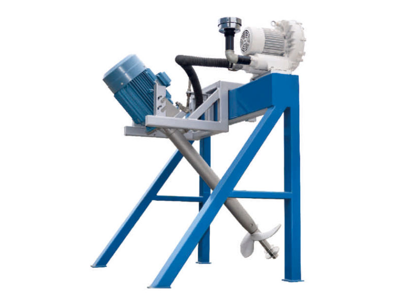 電動機帶動螺旋槳旋轉(zhuǎn),高壓旋渦氣泵使得空氣通過進氣管進入空氣進孔達到螺旋槳,使得其水混合造成微小氣泡,汽水混合物被 迫水平、豎直方向離開螺旋槳,達到有效混合和向水中曝氣。